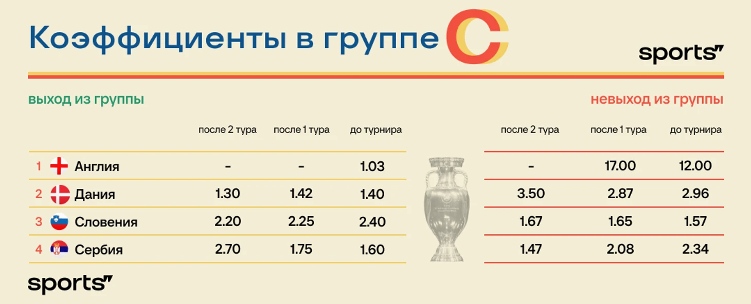 В первом месте Англии почти нет сомнений – предлагают 1.20, а вопрос выхода/невыхода не стоит вообще. У Дании и Словении пока разница 0, поэтому ничьи, возможно, выведут их дальше – но не факт, а победы точно гарантируют проход. Сербии надо только побеждать.