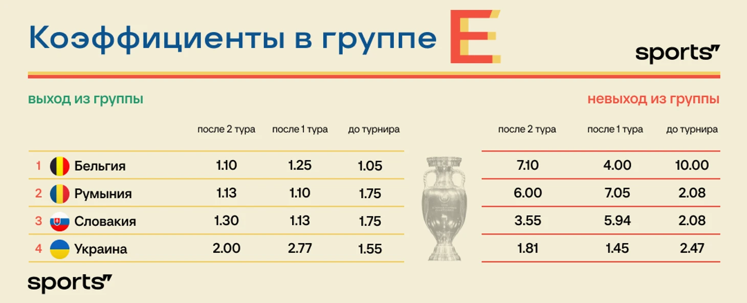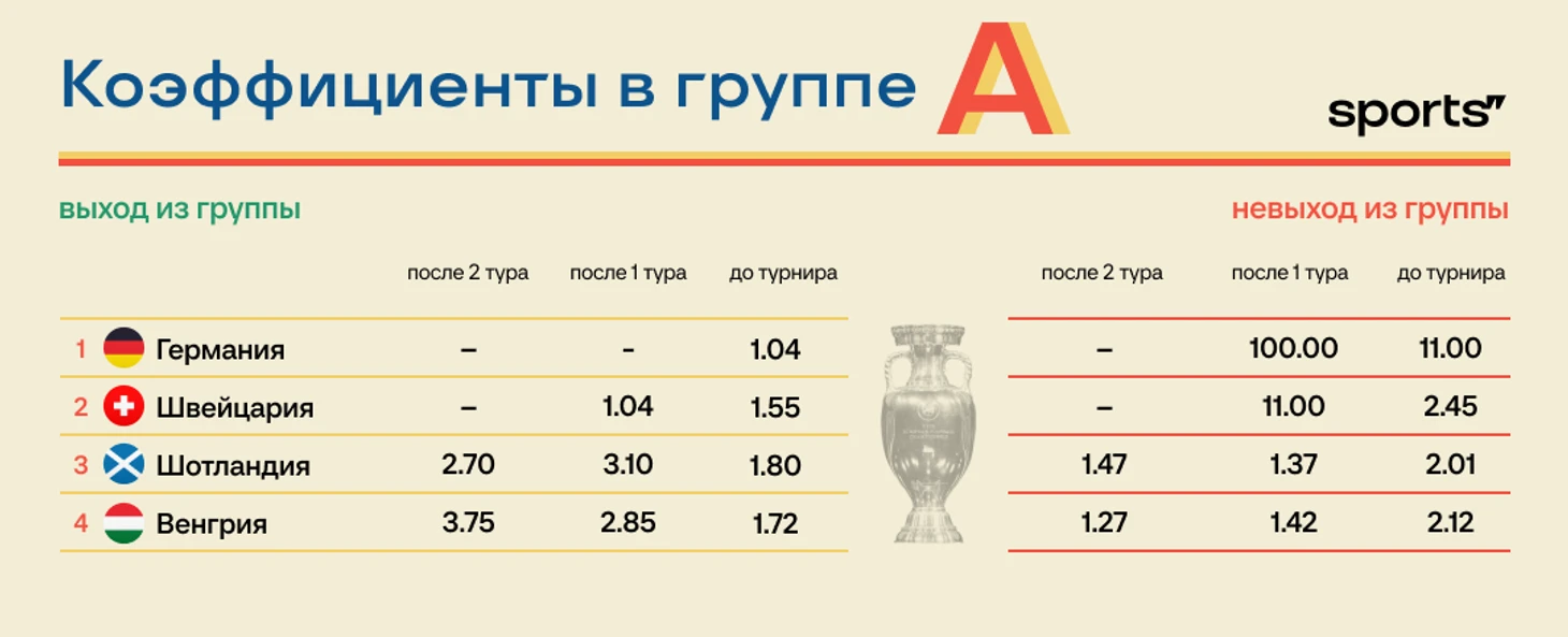 После двух туров Евро-2024 пока не так много вышедших в 1/8 финала, хотя общие очертания участников плей-офф примерно понятны. Как меняются коэффициенты за это время?