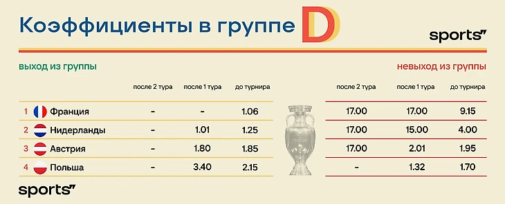 Что в группе D: Нидерланды и Франция – 4 очка, Австрия – 3, Польша – 0. Оставшиеся матчи – Нидерланды против австрийцев, французы – против поляков.