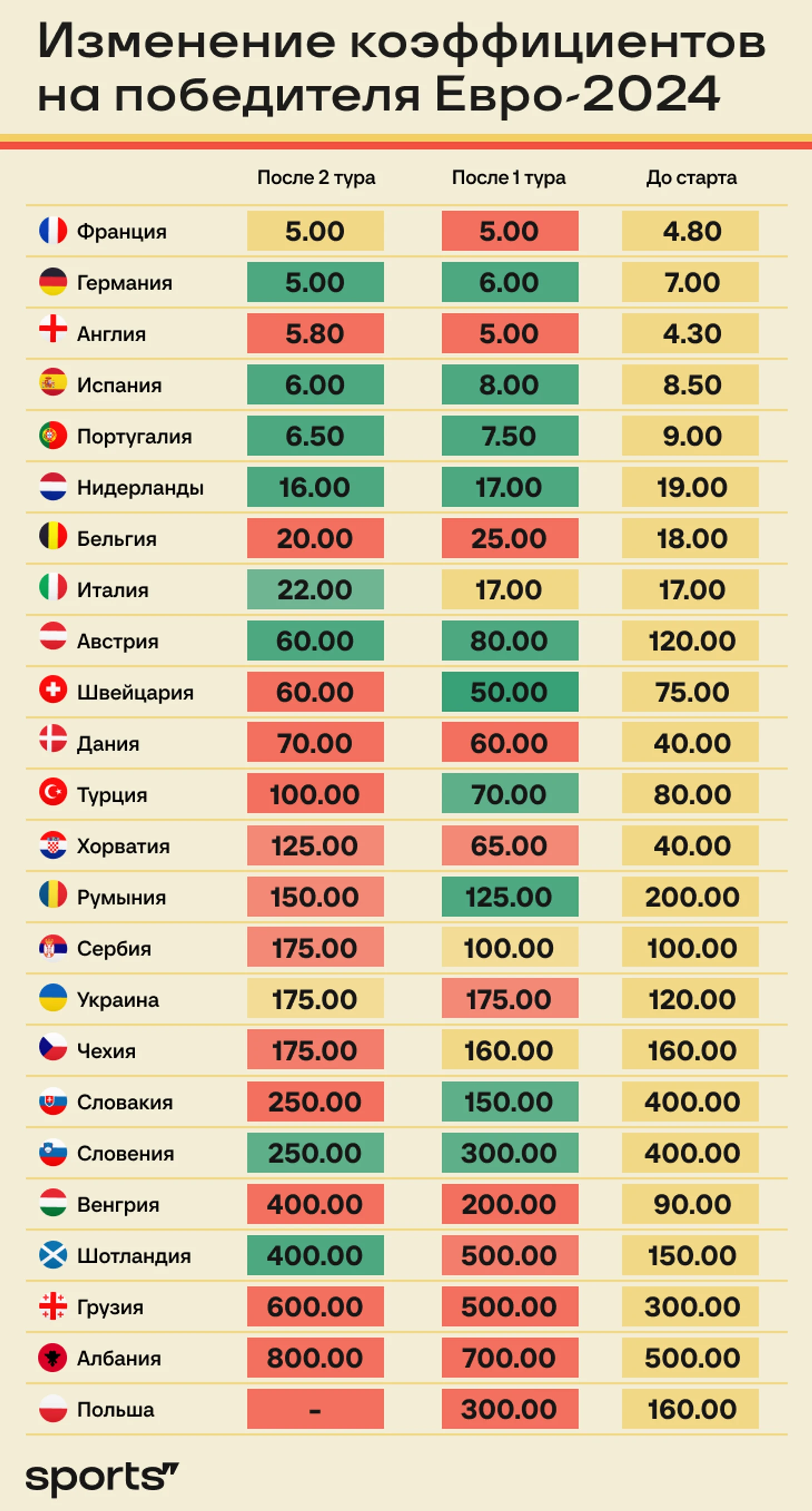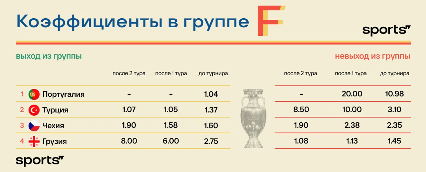 В таблице – коэффициенты на чемпионство до старта Евро, а также после первого и второго туров.