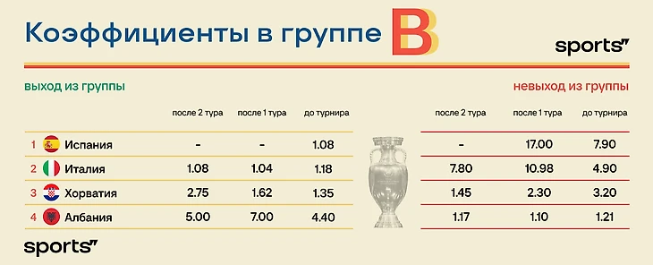 Испания досрочно первая, Италии хватит ничьей, Хорватии и Албании надо обязательно побеждать. Коэффициент на невыход хорватов с каждым туром заметно падает, а у албанцев остается примерно тем же.