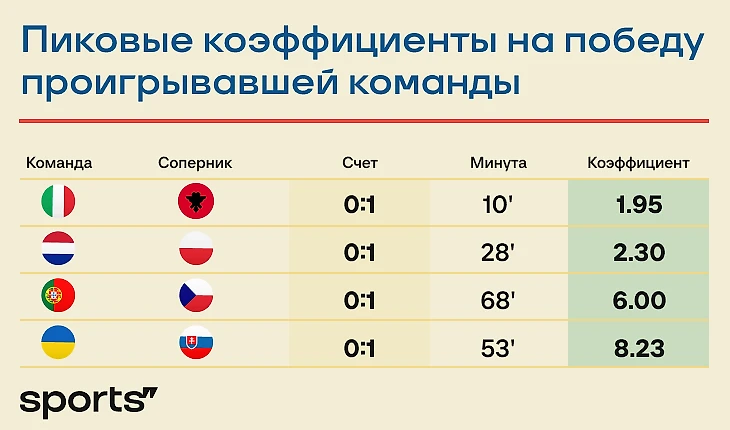 Итальянцы забили ответный мяч очень быстро, поэтому коэффициент вырасти не успел. У голландцев примерно та же история. У Португалии другой момент – пропущенный гол состоялся менее чем за полчаса до конца игры. А у Украины все вместе – явным фаворитом она не была и еще уступала в счете во втором тайме.