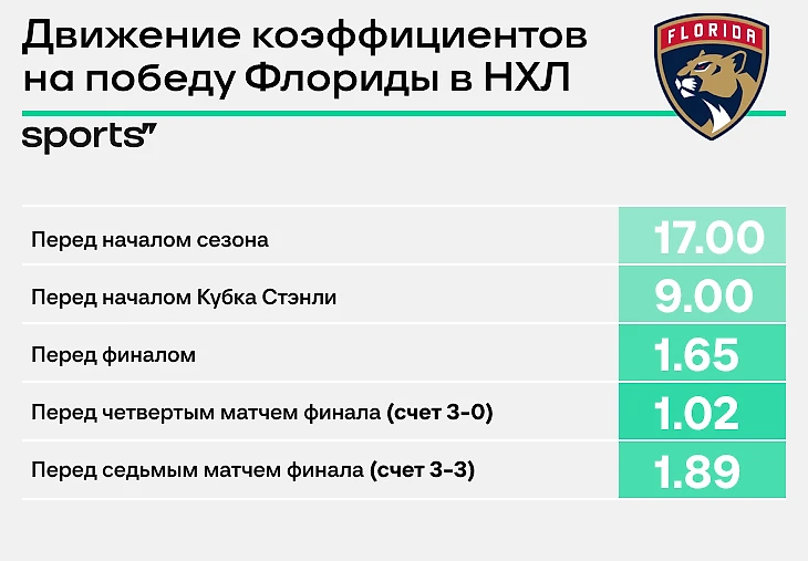 По ходу сезона коэффициент на «Флориду» строго понижался. Перед плей-офф команда, несмотря на относительно неудачный финиш регулярки, заходила вторым претендентом на кубок – букмекеры ставили выше только «Каролину».