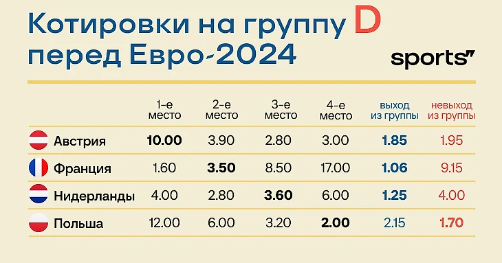 А вот и первая большая сенсация по итогам группы! В квартете D Австрия творит историю и забирает победу у Франции и Нидерландов. Это огромный сюрприз для букмекеров. Австрию очень сильно недооценивали до турнира. Теперь же коэффициент даже на победу в рамках Евро-2024 просто рухнул – со 125.00 до 25.00.