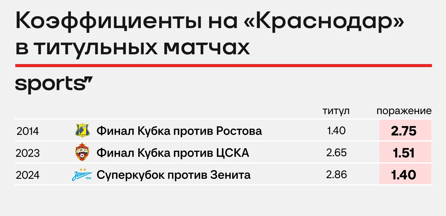 По коэффициентам шансы «Краснодара» на победу в Суперкубке оценивались чуть меньше, чем на завоевание Кубка в финале против ЦСКА, но матчи сложились совсем по-разному. А итог один и тот же – без трофея.