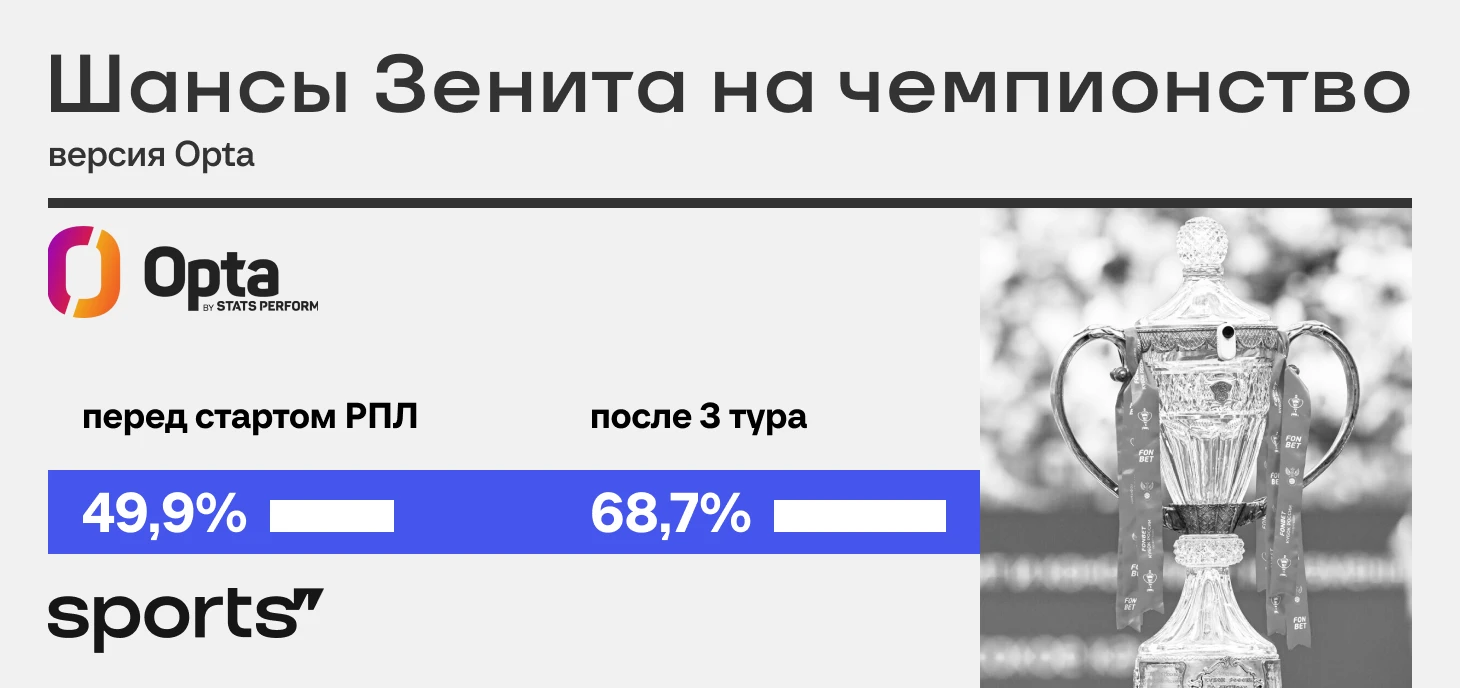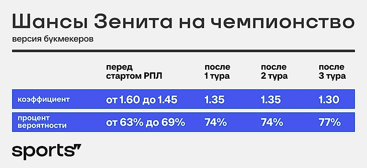 Сейчас после трех туров отрыв стал еще более заметным: у «Зенита» – 68,7%, а ближайший преследователь – тот же ЦСКА с низкими 9,5%. «Динамо» рядом – 9,2%. «Спартак», видимо, разочаровал еще в первом туре – крошечные 4,2%.