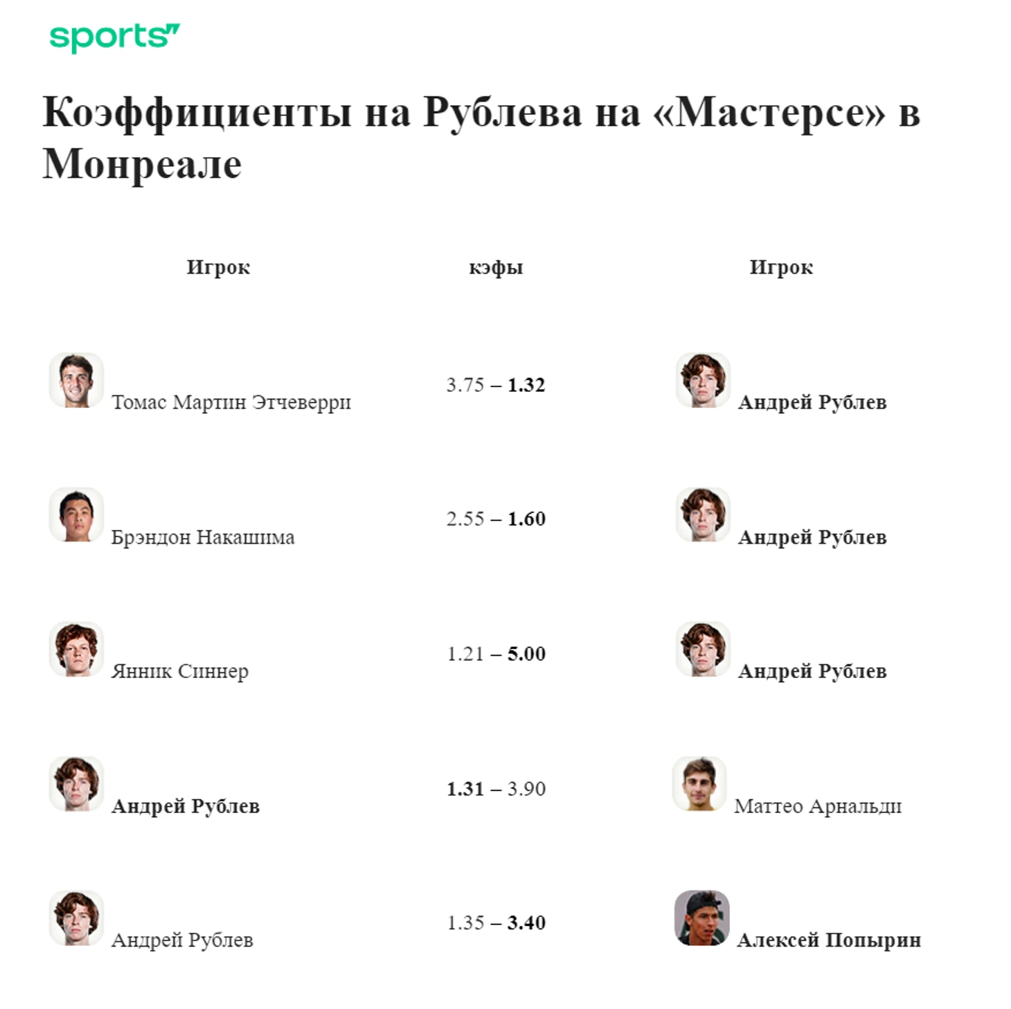 Рублев не единственный, кто внезапно оказался в финале. Австралийца Алексея Попырина там ждали еще меньше, поэтому явным фаворитом противостояния котировался Андрей – 1.35 против 3.40 у соперника.