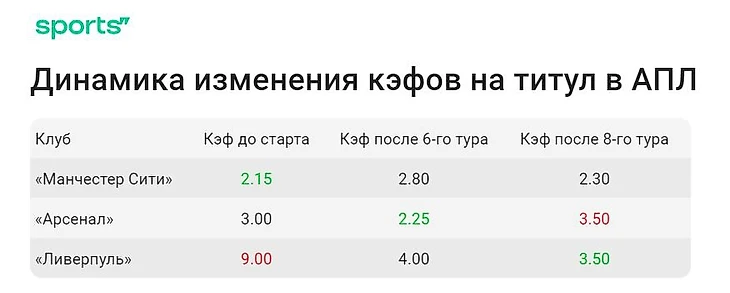 «Манчестер Сити» машет ручкой всем тем, кто не успел взять титул «горожан» в АПЛ за 2.80 – теперь только максимум 2.40. Зато у некоторых букмекеров можно поймать «Арсенал» за 3.50, но поверит ли теперь кто-то в такое счастье Микеля Артеты?