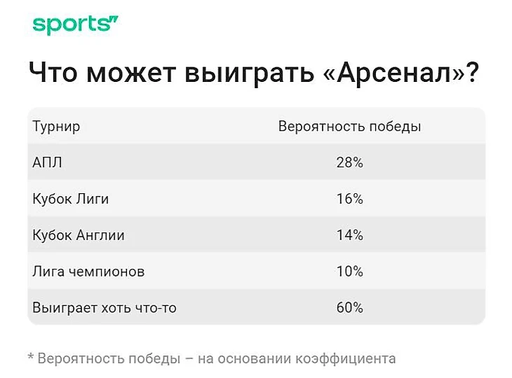 Букмекеры предполагают, что «Арсенал» снова может ничего не выиграть – вероятность около 40%. В АПЛ расклад сил разобрали выше; в Лиге чемпионов в приоритете стоят «Реал» и «Манчестер Сити»; в Кубке Англии – только 7.00 на трофей. Триумф в Кубке Лиги вероятнее – 6.00. Сосредоточится ли «Арсенал» на этом турнире?