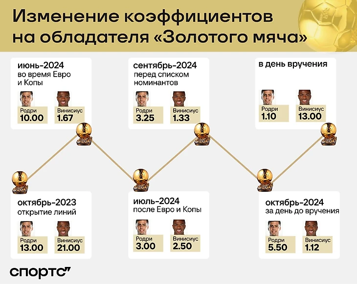 Осенью коэффициент на игрока «Реала» стал заметно рушиться, на полузащитника «Ман Сити» – понемногу расти. Винисиус становился явным фаворитом: за день до вручения «Золотого мяча» шансы оценивались в 89%. Казалось, все слишком очевидно.