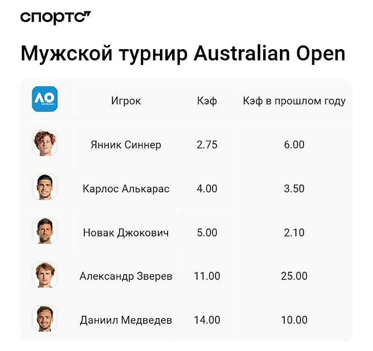 Александр Зверев, несмотря на второй номер в рейтинге, располагается только четвертым с двузначным коэффициентом 11.00. Аналитики относительно неожиданно дают всего 5.00 на Джоковича. Алькарас предсказуемо идет вторым с вероятностью победы в турнире в 25%.
