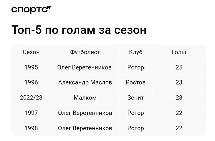 Рекорд Олега Веретенникова долгое время казался вечным. Толком никто и близко не приближался к достижению футболиста «Ротора». Впервые в XXI веке интрига ожила только в сезоне-2022/23. В 25-м туре Малком оформил покер в матче против «Крыльев Советов» и оказался в трех мячах от повторения рекорда. «Зенит» тогда досрочно стал чемпионом, бразилец в итоге забил 23-й мяч в 27-м туре и… уехал в отпуск. Предпочел рекорду отдых на родине.