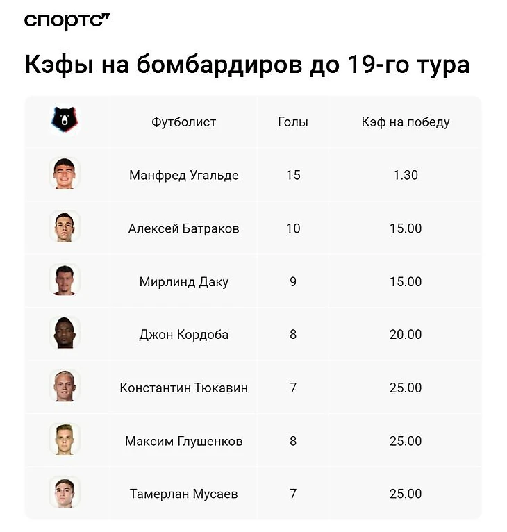 В РПЛ очень запутанная гонка за чемпионство, нет ясности с тройкой и все плотно в подвале таблицы. Единственная неожиданная история без интриги – рейтинг лучших бомбардиров. Тут какие-либо вопросы могли возникнуть только в случае трансфера Манфреда Угальде. Костариканец остался в «Спартаке», поэтому и коэффициент на его победу в гонке бомбардиров устоял – 1.15.