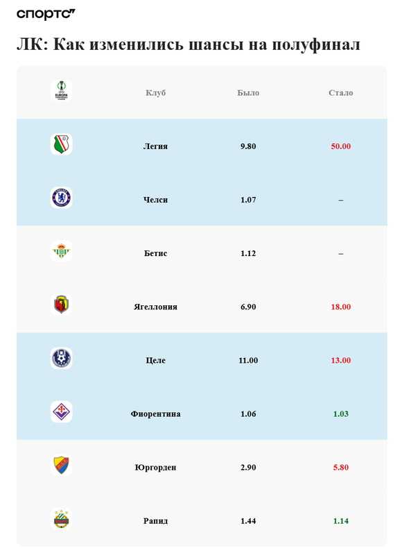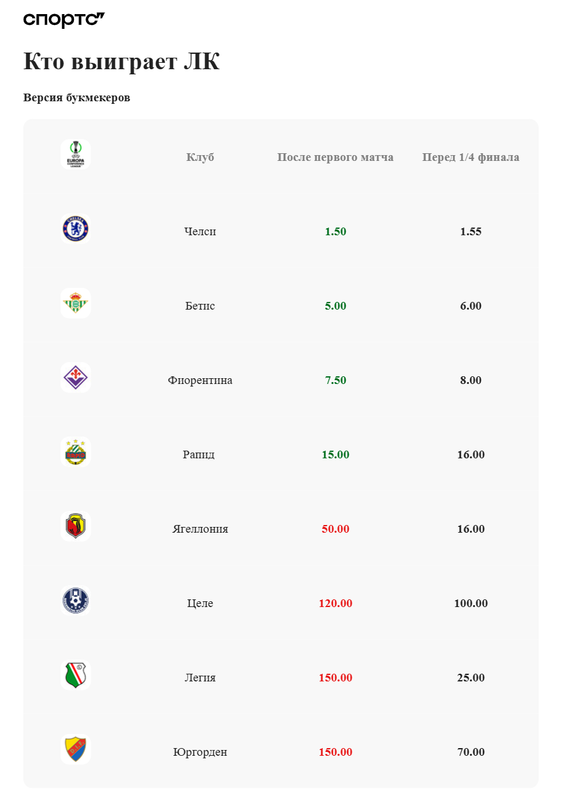 В ЛК по фаворитам изменений нет. «Челси» остается главным претендентом на трофей. Серьезных соперников не ожидается до финала: в полуфинале англичане встретятся с «Рапидом» или «Юргорденом». На «Бетис» и «Фиорентину» дают осторожные коэффициенты: они в полуфинале выходят друг на друга.