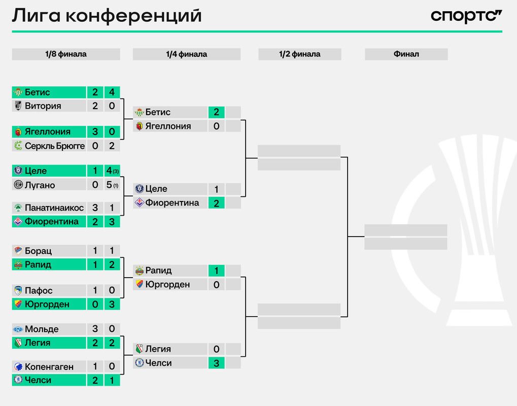 Два других фаворита справились скромнее. «Бетис» победил «Ягеллонию» (2:0), а «Фиорентина» минимально обыграла «Целе» (2:1). Букмекеры, конечно, ждали большего, но интриг на ответные игры в этих парах нет.