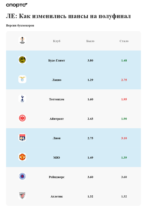 В ЛЕ обновлений нет, букмекеры все еще пересчитывают расклады. Перед 1/4 финала в группе фаворитов были «Атлетик» (4.50), «МЮ» (4.80), «Лацио» (5.00) и «Тоттенхэм» (5.00). Результаты первых матчей подсказывают, что эта компания рассыпалась.