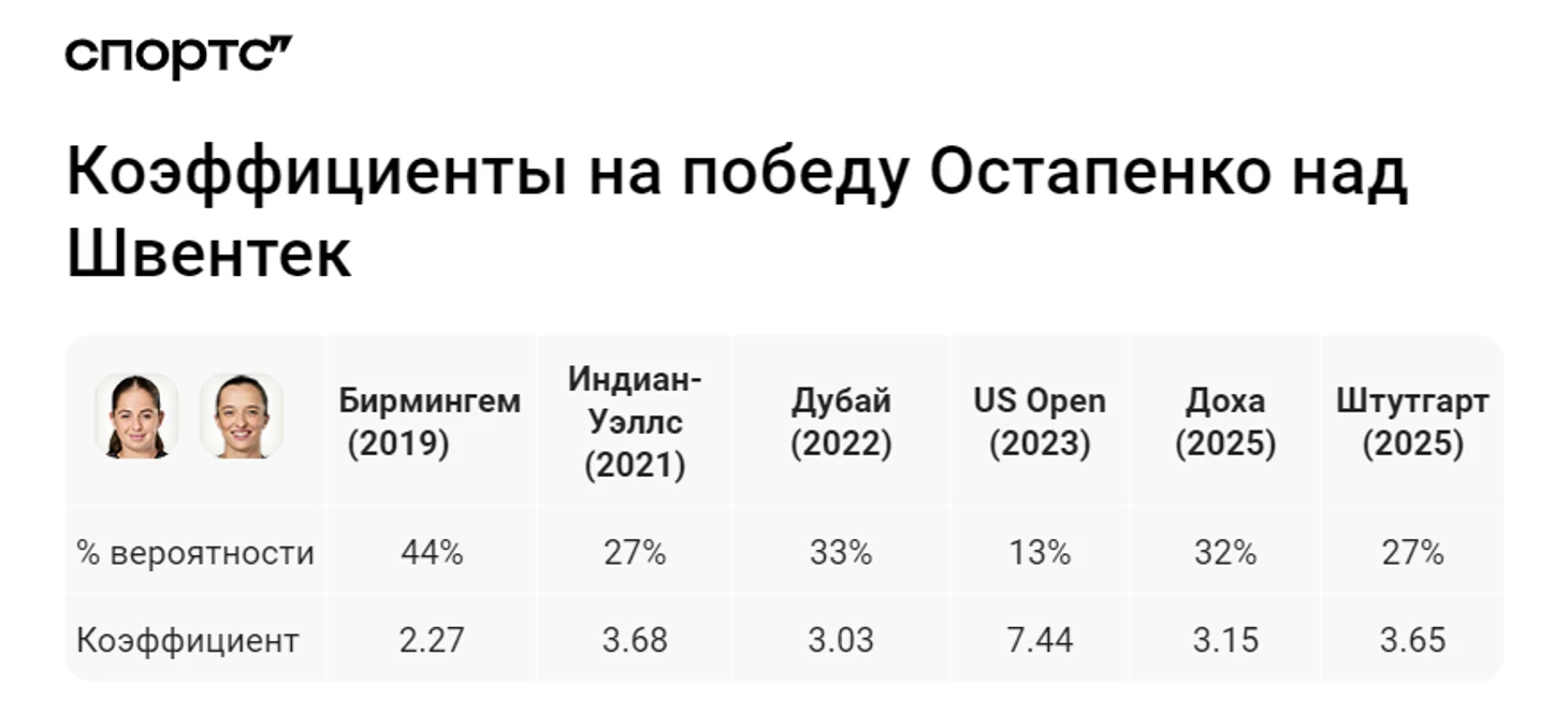 Похожие цифры были и в прошлых матчах за исключением одного, в котором вероятность успеха Остапенко была еще ниже.