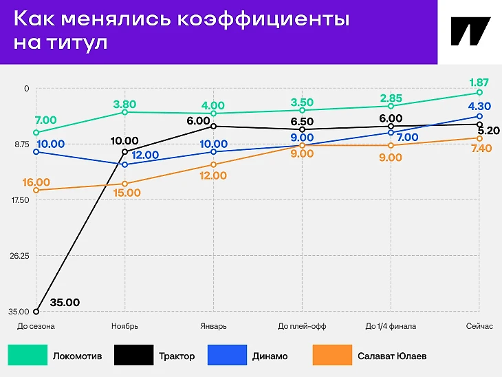 А выше «Трактора» держали с десяток команд. Челябинцы до старта чемпионата оценивались коэффициентом 35.00. Это одна из главных сенсаций за несколько лет. Вероятность победы в Кубке Гагарина была меньше 3%, а теперь приближается к 20.