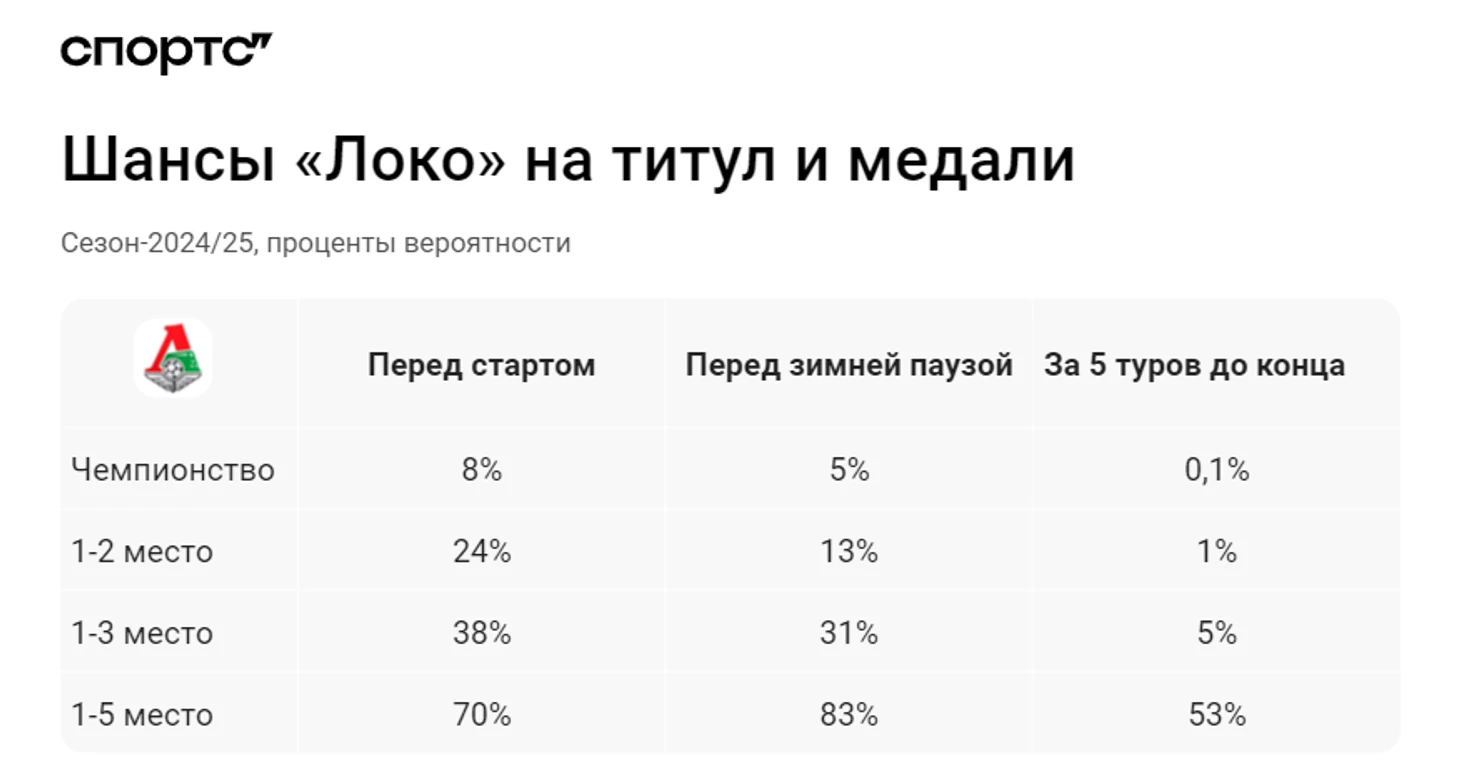 При этом в пятерке «Локо» ждали. После 18-го тура команда шла пятой, опережая на четыре очка ЦСКА. Сейчас – шестое место, до пятого два, но там уже не ЦСКА, а «Динамо». Шансы динамовцев на топ-5 перед этим туром оценивались в 69%.