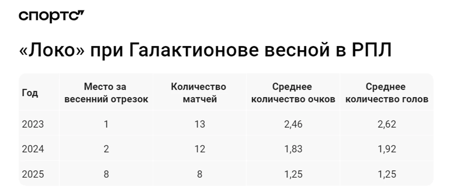 Самая слабая весна «Локо» Галактионова: лишь 2 победы, в 2 раза меньше очков, чем в 2023-м