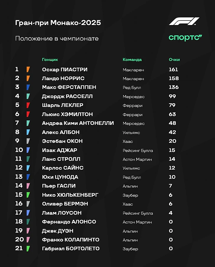 Гран-при Монако серьезно уплотнил верхушку личного зачета. Оскара Пиастри и Ландо Норриса теперь разделяет всего три очка. Макс Ферстаппен тоже до сих пор в чемпионской гонке, он финишировал четвертым в Монте-Карло и держится на расстоянии атаки.