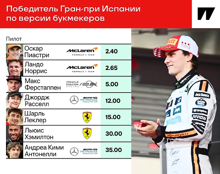 В раскладах на очередной этап мало что изменилось. Букмекеры снова прогнозируют успех «Макларену». Британская команда не побеждала здесь с 2005-го, так что есть отличный шанс закрыть 20-летнюю паузу. Заодно и прервать серию Ферстаппена, который выиграл три последних Гран-при Испании подряд.