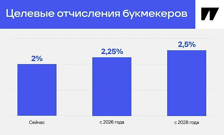 Сейчас букмекеры платят 2% выручки – так будет до конца 2025-го. С 1 января 2026-го понадобится отдавать 2,25%, а с 1 января 2028-го – 2,5%.