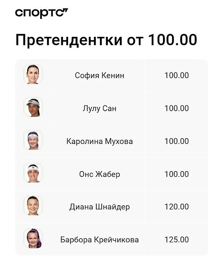 Из россиянок в диапазон от 100.00 до 200.00 пока попадают Диана Шнайдер и Вероника Кудерметова.