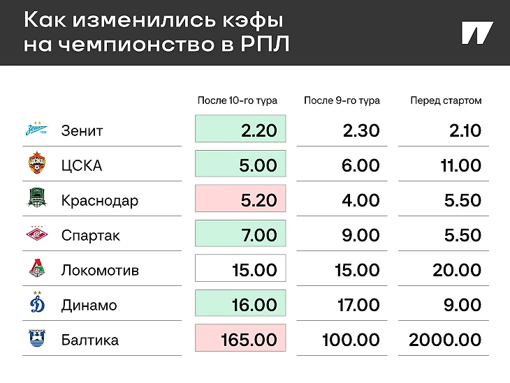 ● «Зенит» набрал 13 очков из 15 возможных в пяти матчах. Еще и оформил пугающую разницу мячей 13:2. Букмекеры постепенно сбрасывают коэффициент на титул – а ведь две недели назад фаворит стоял на одном уровне с «Краснодаром».