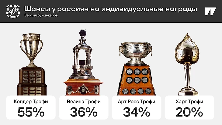 Главным фаворитом считается форвард «Монреаля» Иван Демидов – уверенно стоит первым в гонке за звание лучшего новичка сезона. После успешного старта подскочили вверх шансы на «Везину» у Игоря Шестеркина. Вратарь «Рейнджерс» в линии букмекеров уступает только Коннору Хелибаку.