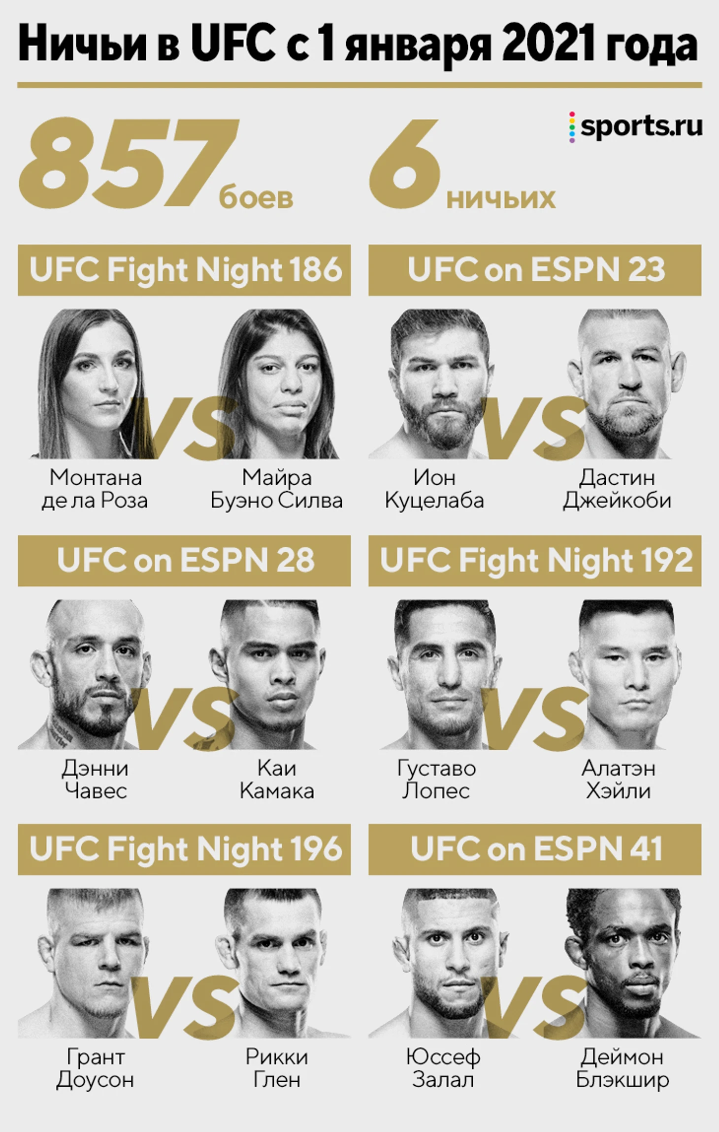 Совсем нечасто. С 1 января 2021 года в рамках всех ивентов промоушена UFC состоялось 857 поединков, лишь шесть из которых завершились вничью. То есть всего 0,7% от общего числа боев.