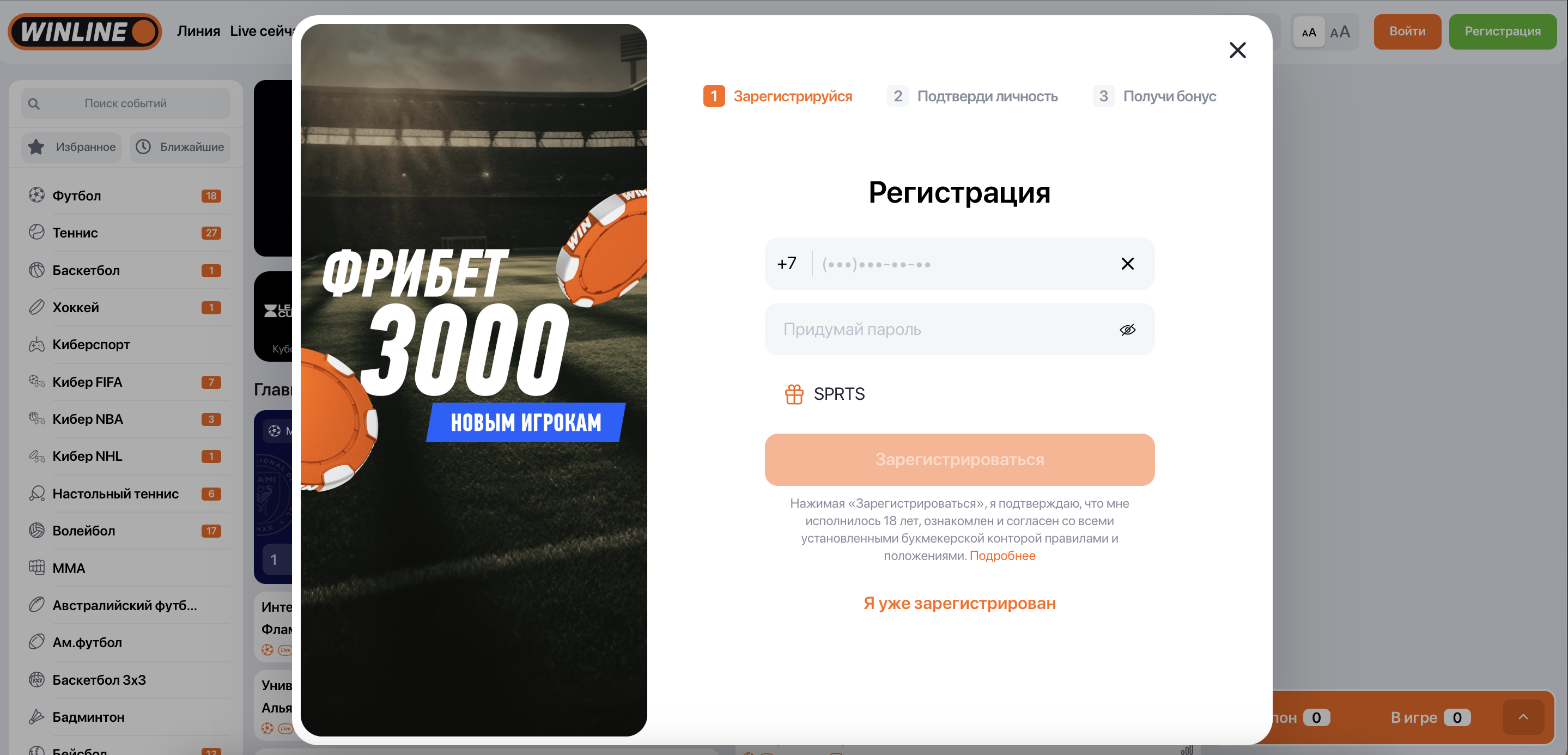 Для размещения ставок на спорт в БК WINLINE необходимо создать учетную запись и пройти процедуру идентификации личности. О том, как зарегистрироваться, как пройти упрощенную и полную идентификацию, а кроме того забрать фрибет 3 000 рублей – читайте в нашем обзоре.