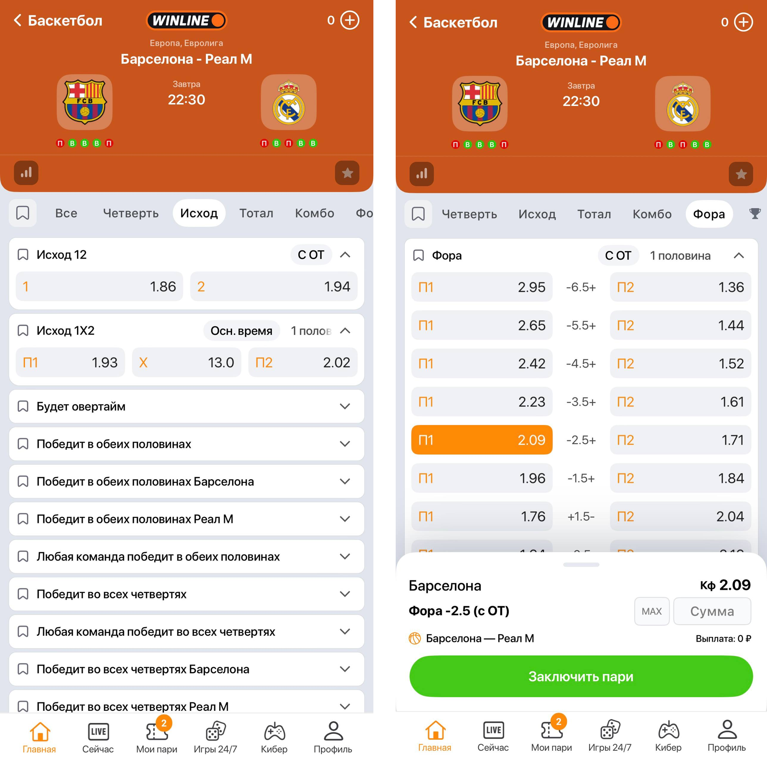 Заключить пари с форой можно на следующие маркеты баскетбольной встречи: