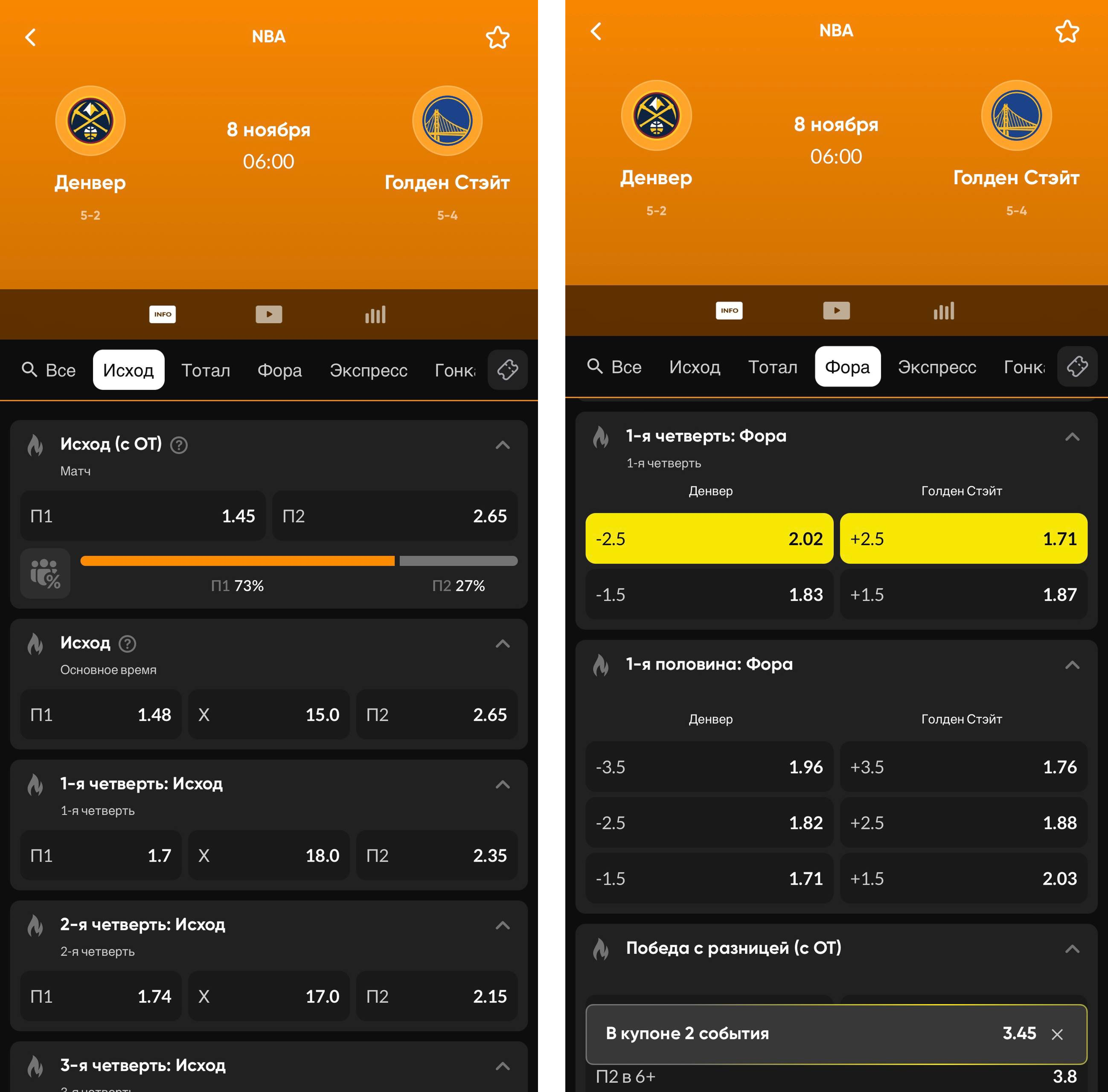 Матч NBA «Денвер» – «Голден Стэйт». Делаем ставку на победу хозяев в первой четверти с форой (-2,5) за коэффициент 2.02. Чтобы ставка прошла, «Денвер» должны выиграть стартовую четверть с разницей в 3 и более очков. Обратное пари – гандикап (+2,5) на «ГСВ» в первой четверти за 1.71. Для прохода пари подойдет любая победа гостей в стартовом отрезке игры либо проигрыш не более чем в 2 очка.