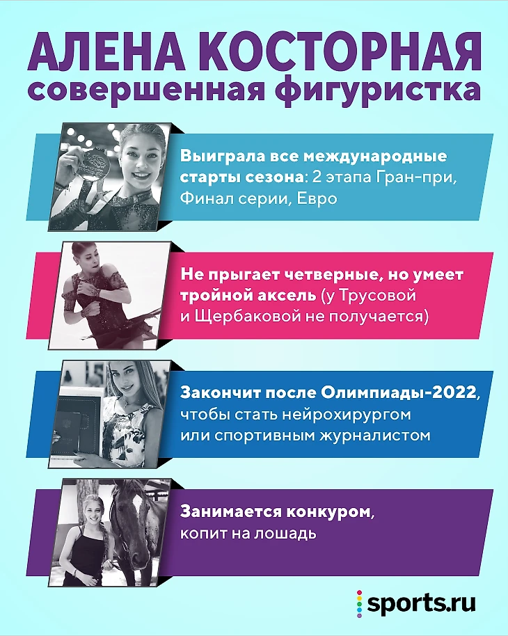Косторная честно говорит, что долгая спортивная карьера (как и работа тренером) ее не слишком привлекает. Цель – Олимпиада-2022 в Пекине, после которой на первое место выйдут учеба (на нейрохирурга или спортивного журналиста), ледовые шоу и соревнования по конкуру.