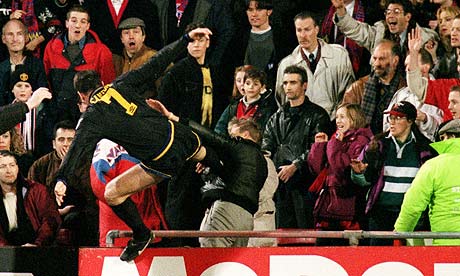 Примеров, когда в роли такого раздражителя выступает профессиональный футболист, не так уж много. Можно просто привести одно фото и даже оставить его без комментариев. Последствия сего перфоманса известны всем любителям английского футбола.
