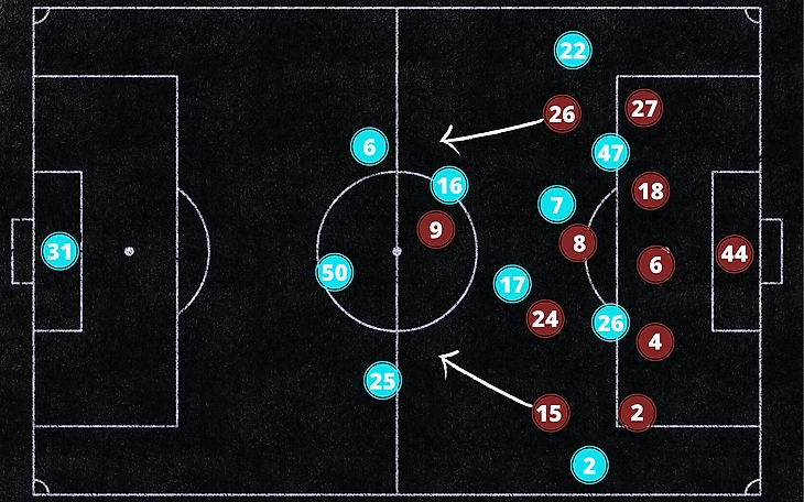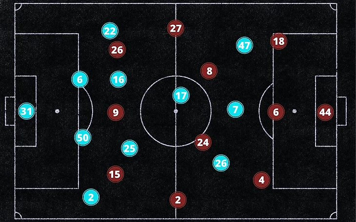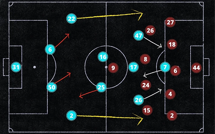 Гвардиола решил играть без классического центрального нападающего, вооружив свою линию атаки несколькими "ложными девятками". Стерлинг располагался на острие атаки МС, но он часто опускался на одну линию с Кевином Де Брюйне, пытаясь создать пространство Марезу и Фодену, которые забегали в зоны полуфлангов. Все игроки нападения "Сити" были под достаточно плотной опекой и не имели возможностей для создания острых моментов.