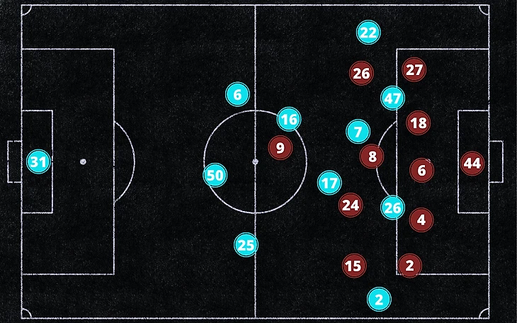 Пеп сыграл без центрального нападающего против команды, которая не собиралась уступить ни единого сантиметра свободного пространства у своей штрафной. Большое количество "ложных девяток" не несло за собой никакой эффективности в атаке, все моменты "Сити" сумел организовать только с помощью стандартов.