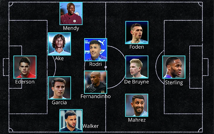 Пеп Гвардиола оказался очень ограничен в ротации своих игроков и был вынужден выпустить Рахима Стерлинга в качестве центрального нападающего. Построение игроков соответствует схеме 4-2-3-1, испанский специалист в очередной раз ставил акцент на владение мячом и активный прессинг соперника.