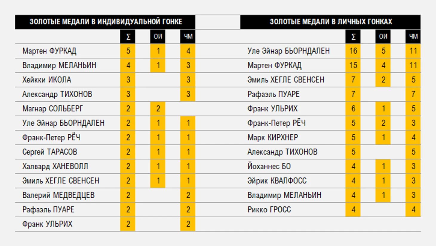 Благодаря победе в Антхольце — кстати, всего третьей на этой трассе в его карьере — Фуркад стал первым четырехкратным чемпионом мира в индивидуальной гонке и сравнялся с Уле-Эйнаром Бьорндаленом по общему числу личных золотых медалей чемпионатов мира.