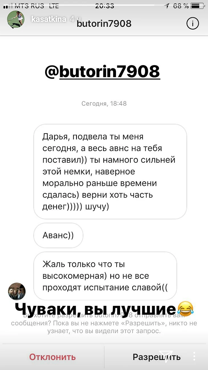 Признание одного из своих болельщиков опубликовала сегодня финалистка Кубка Кремля Дарья Касаткина в своем инстаграме. Тактичности по отношению к нашей теннисистке ему не занимать.