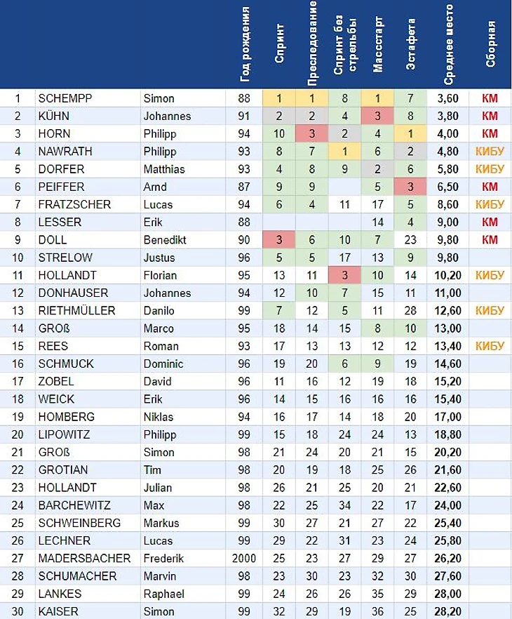 У парней непонятных моментов тоже хватает. Я тоже поначалу возмутился предпочтением Хорна Наврату, но конкуренция выиграна честно. А Филип точно получит свой шанс на КМ. Непонятно, почему прокатили мимо КИБУ Стрелова или Гросса (8 место в решающей гонке), но взяли проваливавшего (для участника КМ прошлого сезона) чепионат Германии Рееса. Видать у него место на КИБУ было забито заранее. Ритмюллер привычно не стабилен в результатах, очень хочется стабилизации на этапах КИБУ.