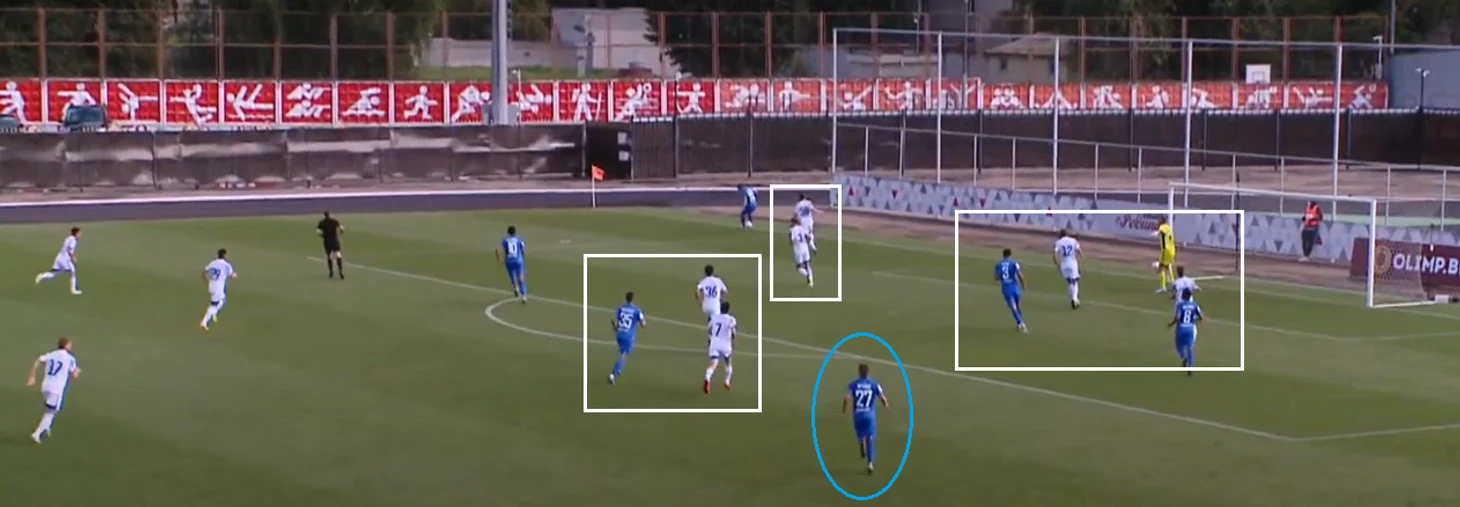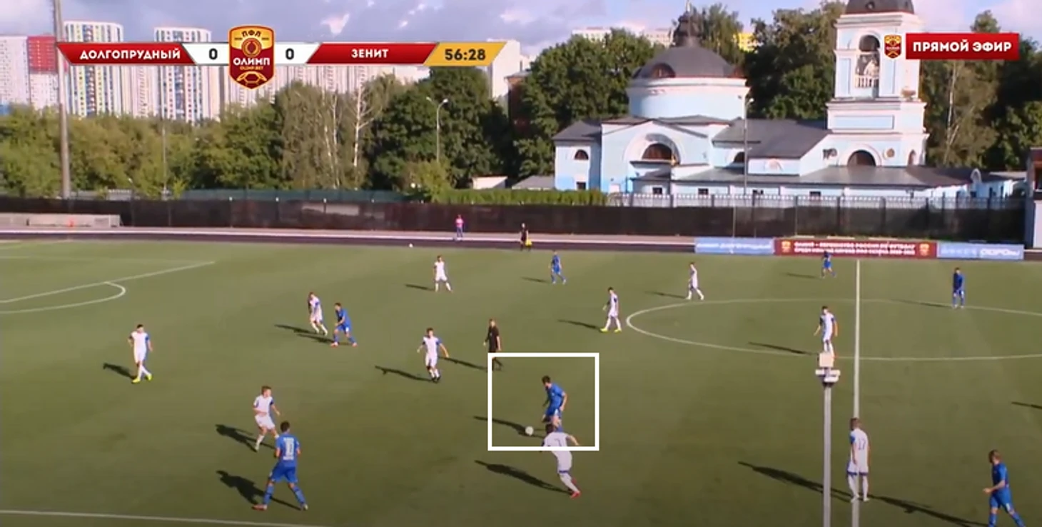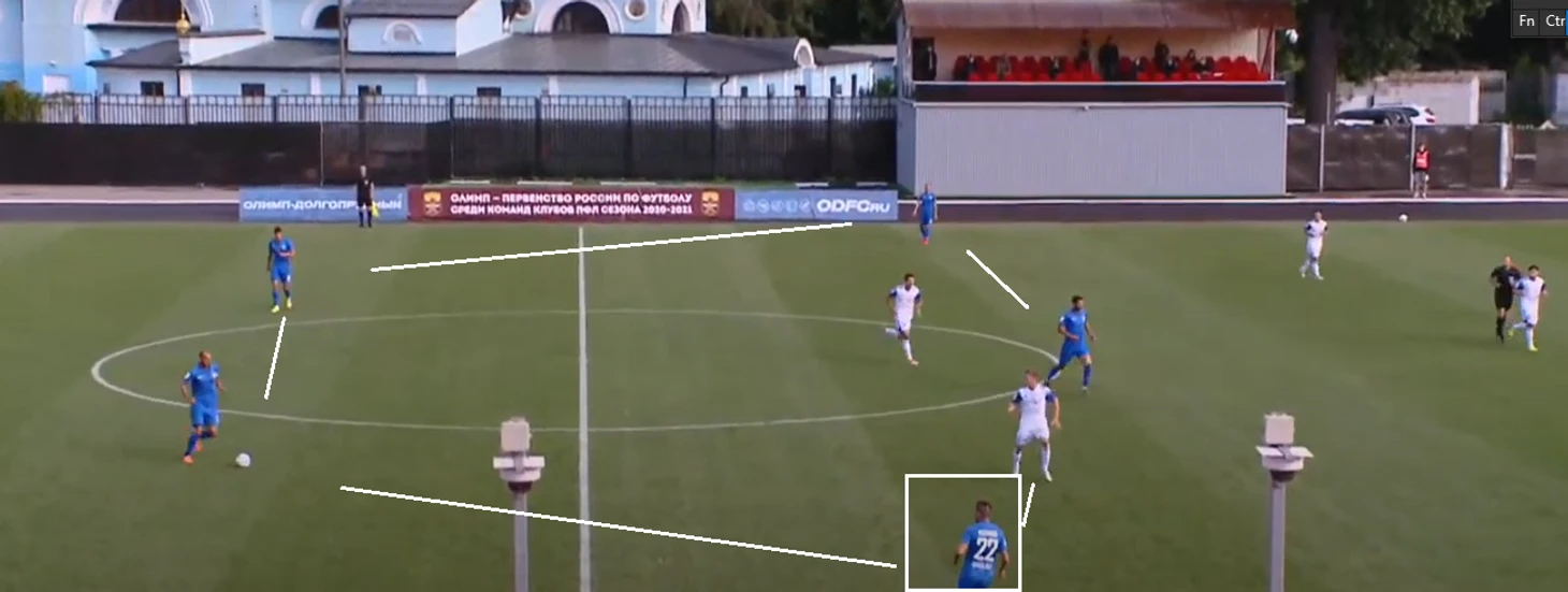 Это создало проблемы « Зениту»— команда из Иркутска зачастую не успевала перестраиваться по мячу в схеме 4-4-2, а если учитывать, что у ОД достаточно сильные фланги, то это являлось проблемой. «Зенит» пытался поднимать выше одного из двух фланговых полузащитников ( по мячу), но это только открывало фланги для атак « Долгопрудного».