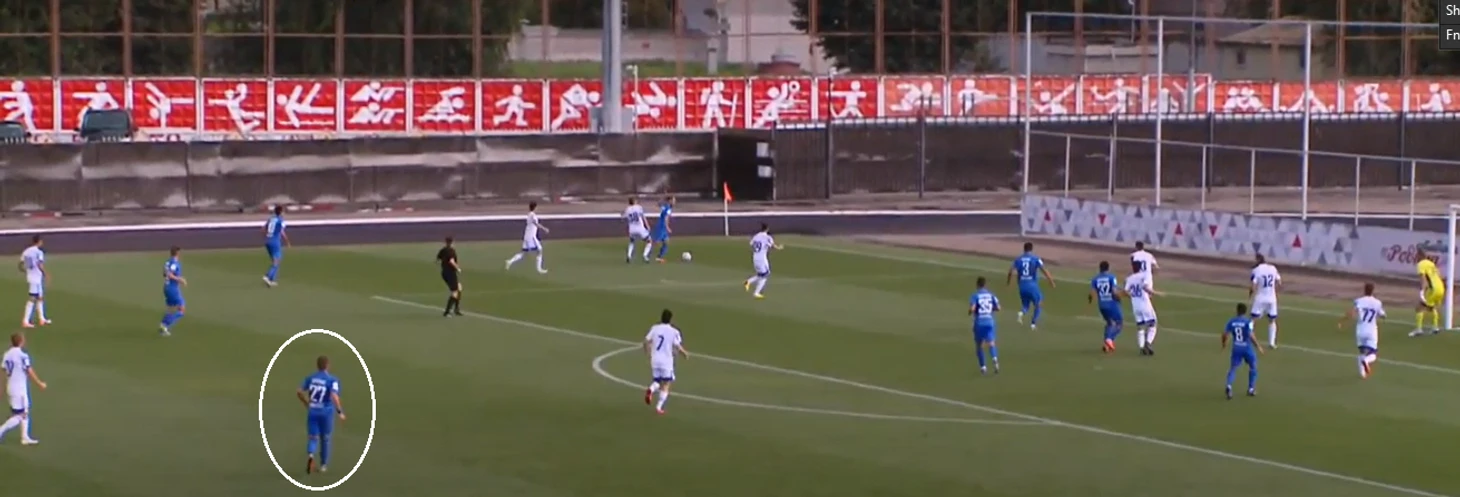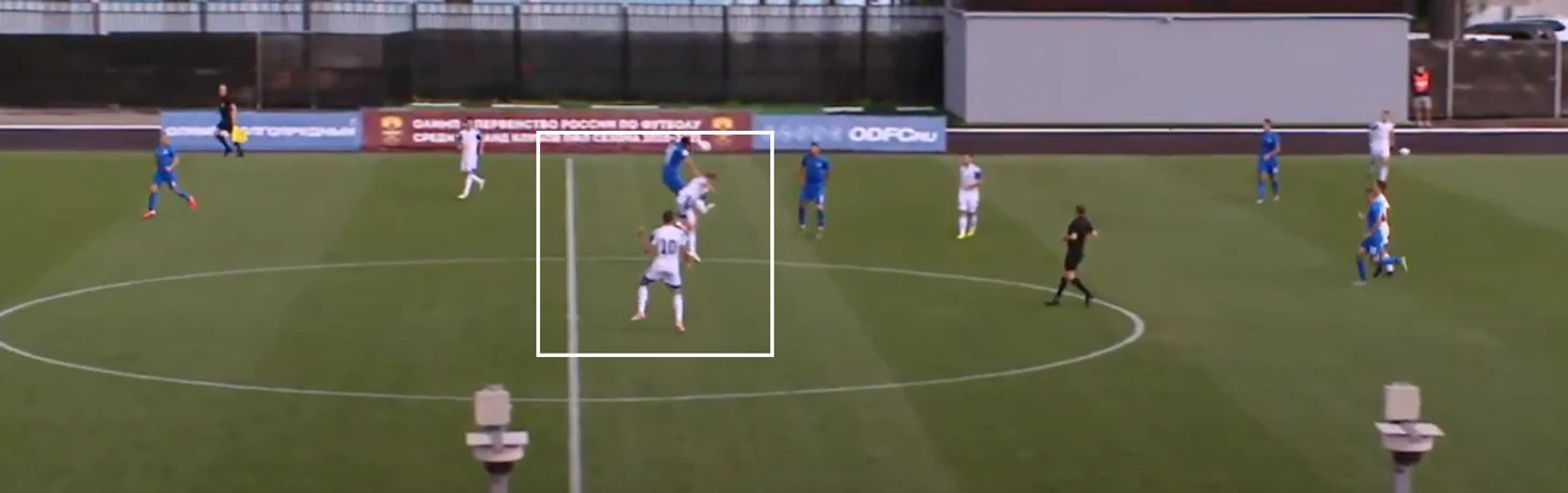 В частности, вот эпизод, где правый защитник расположен всем корпусом вперед и лицом по мячу, когда Баженов уже начинает движение за спину: