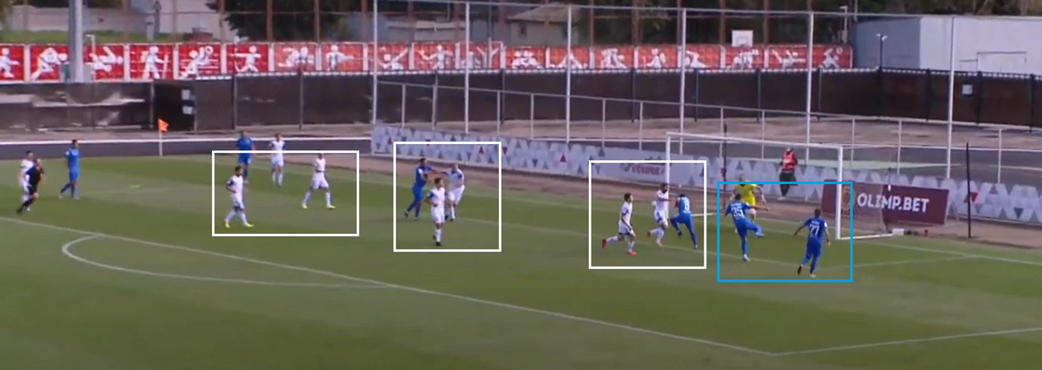 Далее по цепочка возникла вот такая картина, где на дальней штанге оказались трое игроков ОД: