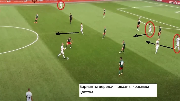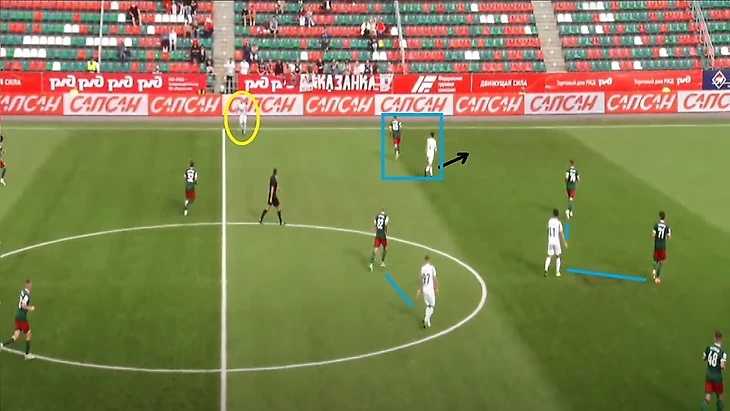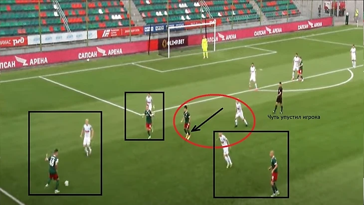 Выше мы рассказали, что «Луки» атакуют через фланги, делая особенный упор на правый. Это логично — хозяева перегружали эту зону, учитывая, что там играет Садыгов, который не слишком хорош в отборе и часто не помогает своему партнеру на фланге: