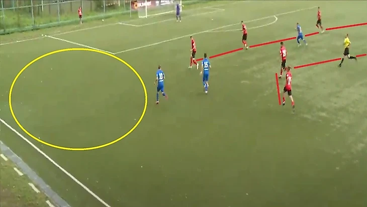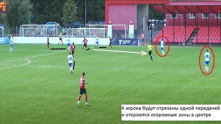 Игрок садится между нападающим и тройкой полузащитников, он оказался один получил мяч и развернул атаку во фланг