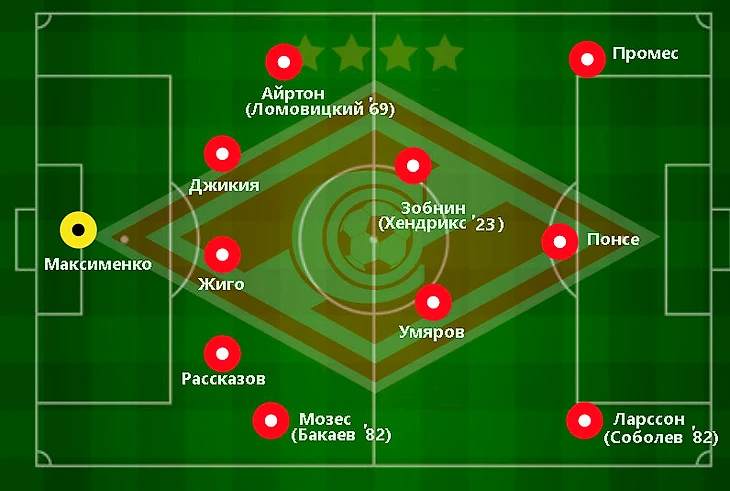 Руй Витория снова достал конспекты Тедеско (привет, Чернявский) и выставил трех центральных защитников, причем место одного из них занял Рассказов (забегая вперед — один из худших на поле). Настолько ли не в форме Кутепов, имеющий опыт игры в тройке и так ли не соответствует уровню Кофрие — вопрос не только к тренерскому штабу, но и ко всему руководству «Спартака». Остался на скамейке и Соболев, вместо него в старте оказался Понсе.