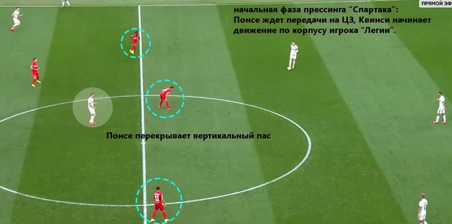«Спартак» вошел в матч с предельной концентрацией и максимальным желанием, что нельзя сказать о тактической стороне вопроса. Модуль прессинга Витории предполагает выдавливание во фланги и накрывание соперника именно там, но с направлением в края у атакующей тройки получалось не всегда. Смотрим ниже, у Понсе двойная роль — перекрыть направление атаки в развитие и прессинговать Ветеска после передачи ему. При этом Ларссон и Промес должны реагировать на этот триггер и включаться в давление. Но если в случае шведа ему позволительно играть по игроку ( персонально по Навроцкому, потому что мяч в другой стороне), то Промес должен перекрывать пас в центр, что у Квинси не очень получалось.