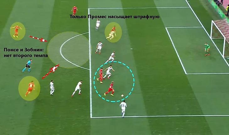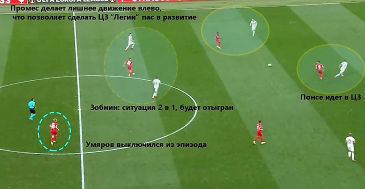 Проблемы в атаке тоже никуда не делись. Да, «Спартак» владел мячом в первом тайме 52% на 48%, да, бил по воротам ( не слишком опасно), но механизмов для взламывания «Легии» было не так уж и много. Вероятно, Витория планировал за счет включения Айртона и Мозеса взламывать передачами вразрез оборону «Легии»; при включении Умярова это получилось пару раз, но на постоянной основе не проходило:
